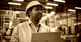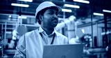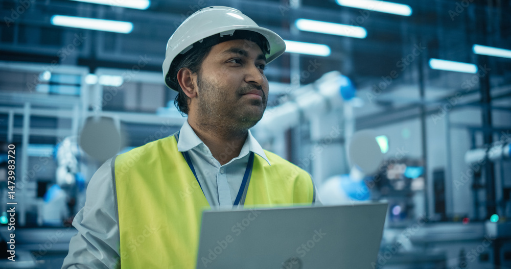 Portrait of an Industrial Systems Administrator Working on Laptop Computer at a Modern Manufacturing Plant. Indian Specialist in a Hard Hat and High Visibility Vest Optimizing Manufacturing Flow