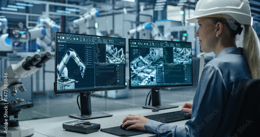 Female Industrial Engineer Working Behind a Desk in a Modern Manufacturing Facility with Automated Robotic Arms. Specialist Monitoring Circuit Board Assembly Line and Optimizing Production Output