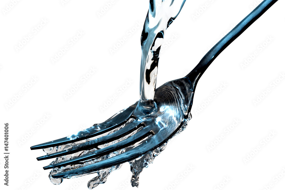 Jet of water washes fork isolated on white background