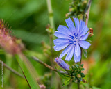 Close-up of a purple wildflower with water droplets on petals after rain. Purple flower with water droplets, close-up, nature photography.