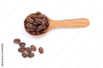 Coffee beans in wooden spoon on white background
