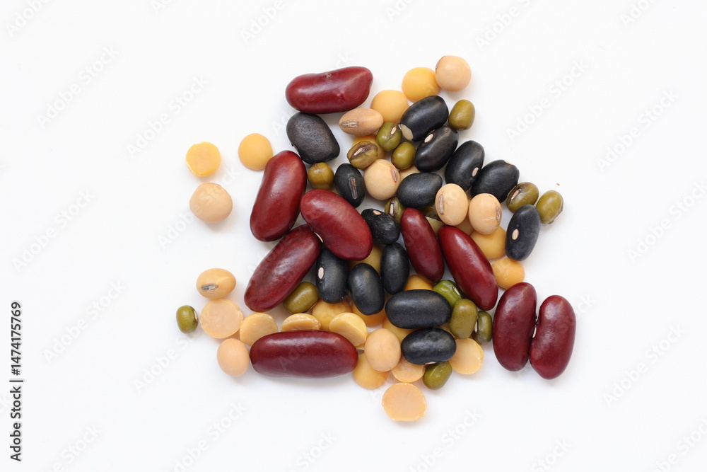 Top view of Red beans black beans soybean with mung bean isolated on white, isolated of Red beans black beans soybeans with mung bean