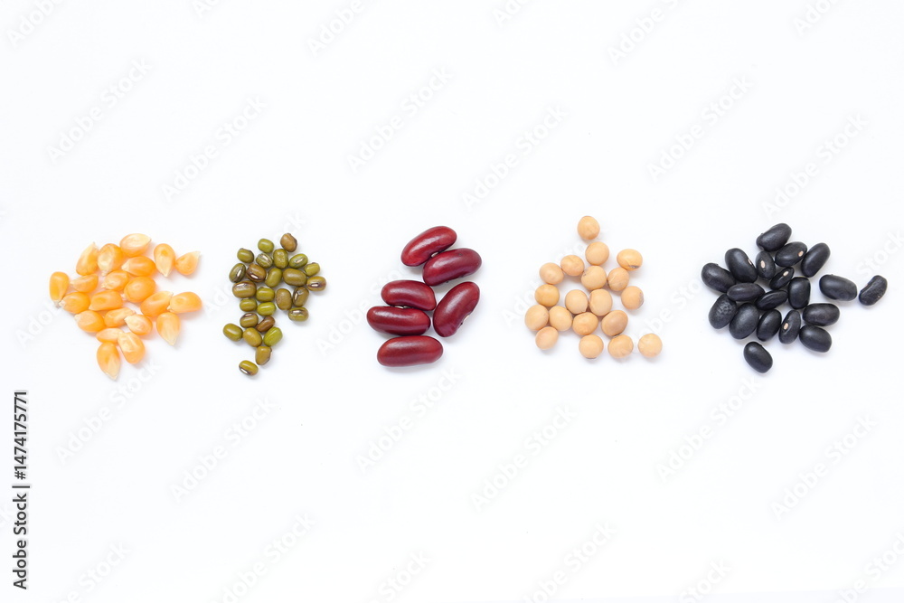 red and green beans, Top view of Red beans black beans soybean with mung bean isolated on white, isolated of Red beans black beans soybeans with mung bean