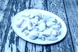 A tray of cooked potato tapas with sauce on a wooden table for a typical Spanish appetizer