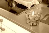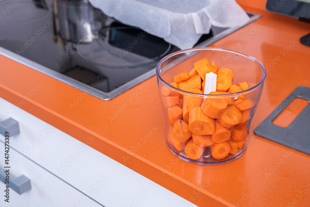 Cut carrots inside a plastic container of an electric chopping machine