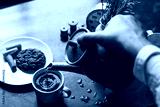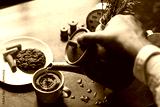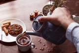 The man pours a cup of hot tea. Sweets lie on the table. He cooks his own breakfast