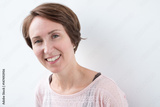 Portrait of self-confident woman in casual clothing style. She smiles broadly. Positive emotions.