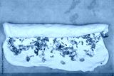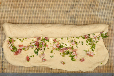 Raw dough is being rolled up with a filling of diced pancetta and green herbs on a baking mat, in the process of making pancetta rolls