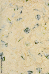 A close-up shows a creamy mixture of fresh cheese, chopped green onions and egg, prepared as a pie filling