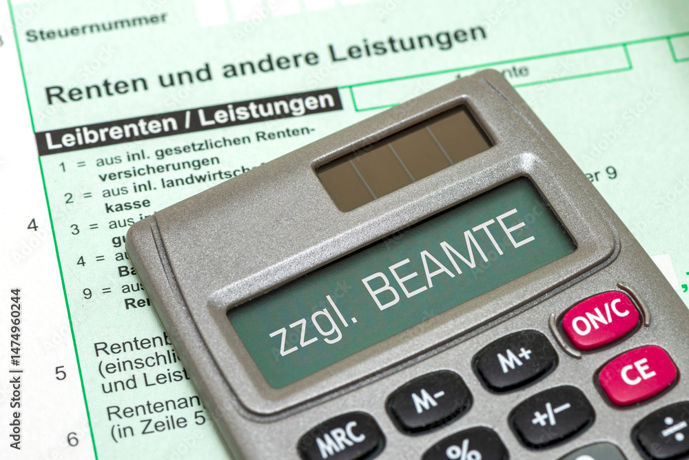Ein Taschenrechner mit der Aufschrift "zzgl. Beamte" im Display liegt auf einer Steuererklärung für Rentenbezug als Symbol für die Beamtenbeteiligung am Beitrag zur Rentenversicherung - FOTOMONTAGE