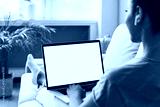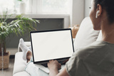 Young woman using laptop computer with blank empty mockup screen. Business woman working at home. Freelance, student lifestyle, e-learning, shopping online, web site, technology concept