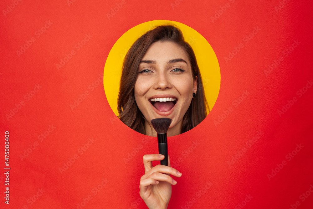 Cheerful woman seen through a colorful circular opening, holding a makeup brush and smiling warmly against a bold and bright backdrop, showcasing creativity and personal care in a vibrant setting.