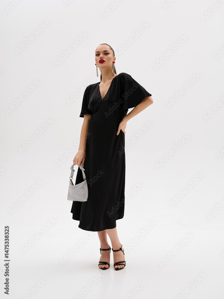 Pregnant girl model in stylish clothes on a colorless background in the studio.