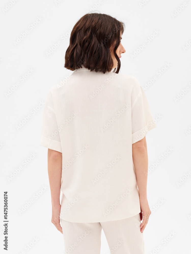 Pregnant girl model in stylish clothes on white background in studio.