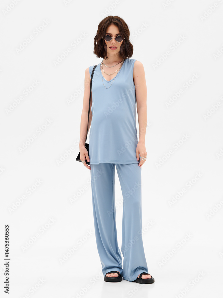 Pregnant girl model in stylish clothes on white background in studio.