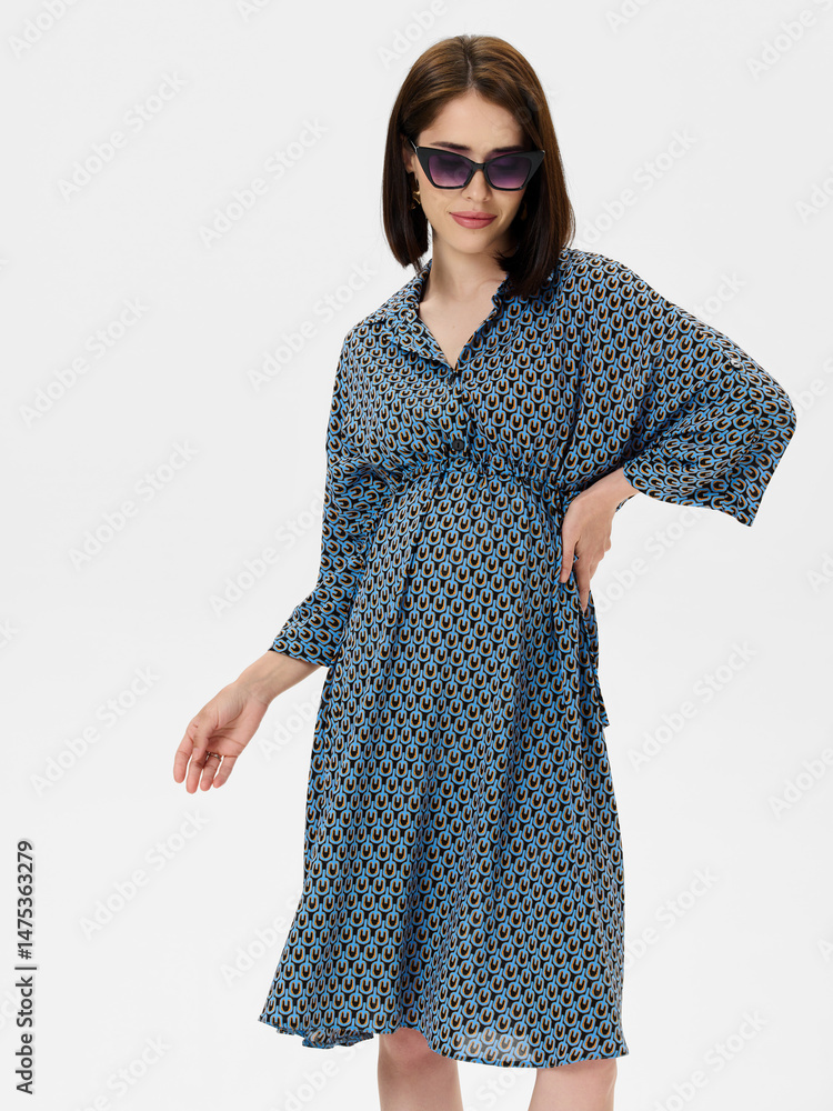Pregnant girl model in stylish clothes on white background in studio.