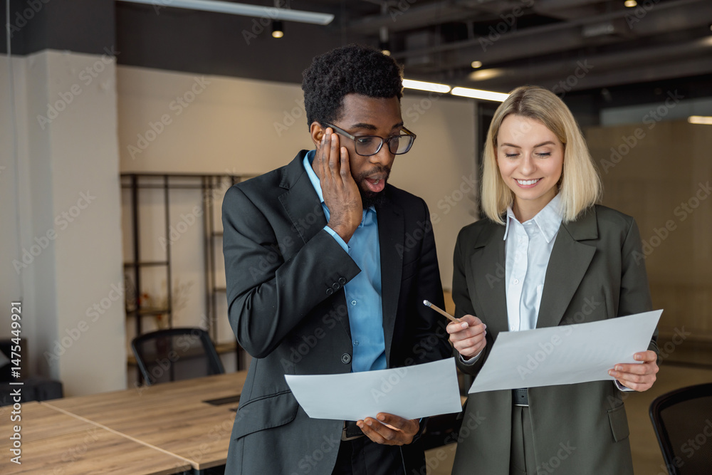 African american lawyer looking surprised while checking the documents his colleague showing him