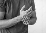 Man suffering from pain in hands and fingers, arthritis inflammation. Red highlight