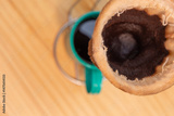 Visão próxima de um coador de café em uso, preenchendo uma xícara esmaltada verde.