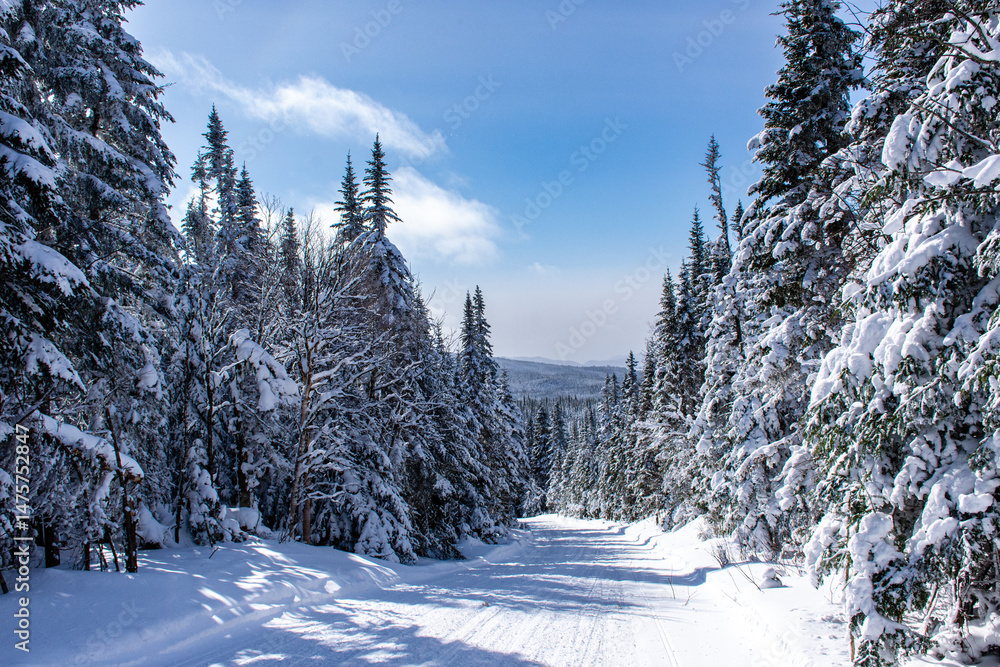 Winter trail through the snowy boreal forest on a beautiful winter day