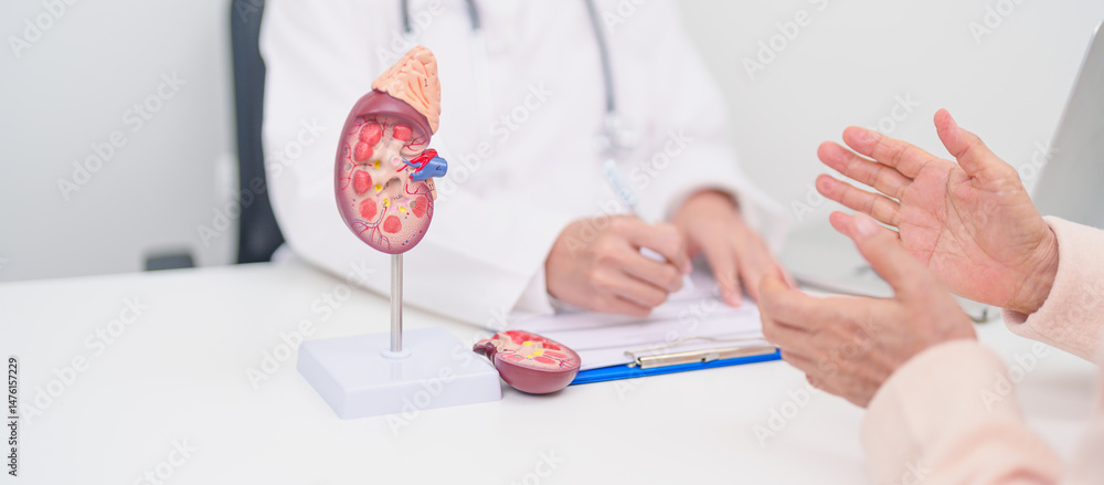 Elderly Patient consultation with doctor for Kidney disease, Urinary system and Stones, Cancer, world kidney day, Chronic kidney, Urology, Nephritis, Renal, Transplant and medical healthcare concept