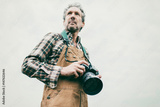 Low angle view of nature photographer outdoor on overcast day.