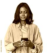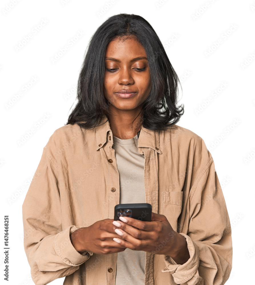 Young Indian woman smiling while texting on a phone in a studio