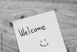 Welcoming note wooden desk home office visual content warm environment close-up perspective