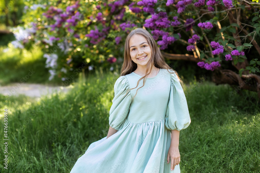 Closeup Portrait of a pretty young little girl with long hair and in dress is standing in a lilac spring garden. Gardening, florist, flower girl. Allergy free. A child girl walks in a flowered park.