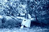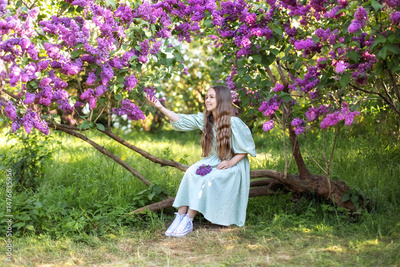 Happy portrait of a beautiful girl with long hair and in dress sitting near a blossoming lilac. Little Smiling Girl enjoying beauty of nature looking at Flowering lilac bushes in garden.