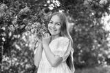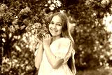 Portrait of a beautiful little girl in a lilac garden. A child girl walks in a flowered park. Outdoor fashion photo of a cute smiling young girl with long hair surrounded by flowers.