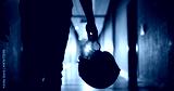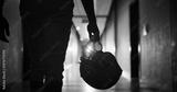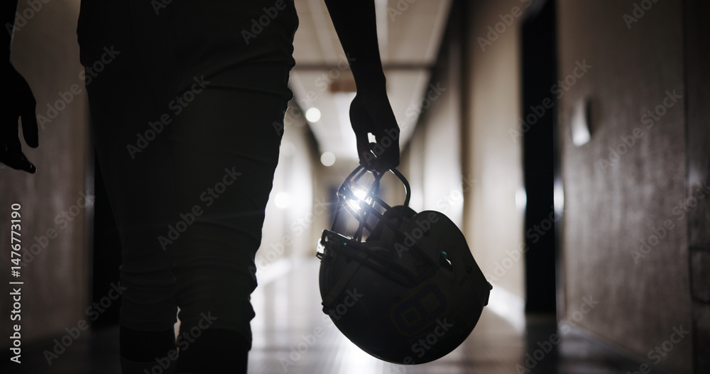 Helmet, football and hands of man in corridor for sports competition, stadium match and game. Fitness, pro league player and athlete with person in tunnel for training, tournament and contest