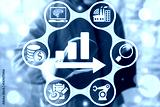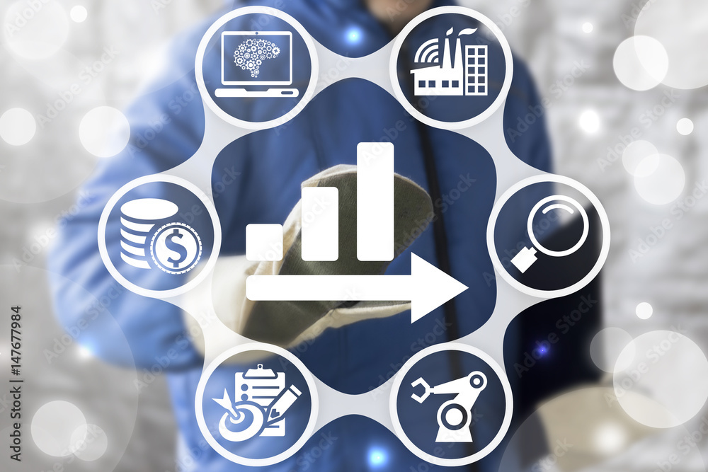 Industry data market elements. Worker or man pressing chart button on virtual touch screen. Industrial report graph. Trendy manufacturing diagram. Analytics and analysis of manufacture statistics.