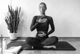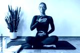 Calm woman using Pranayama breathing technique while practicing Yoga. Zen-like woman with eyes closed doing Yoga breathing exercise in health club. Copy space.