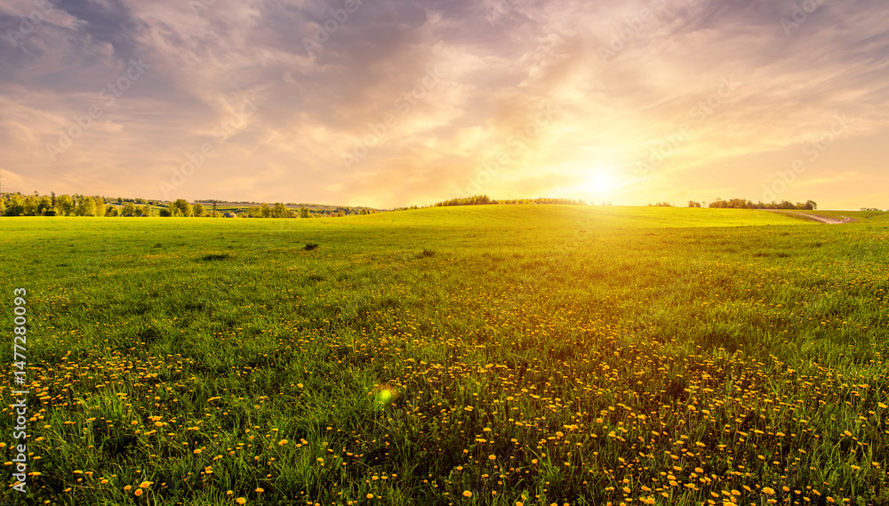 Bright vivid rural landscape at sunset, warm summer field with many yellow dandelion flowers for nature desktop background. Calm pastoral scenery for inspirational banner.