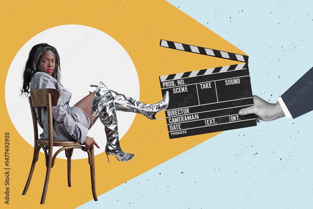 Movie clapper. Vintage retro film movie clapper. Vintage cinema poster. best. Concept of rest and entertainmen in film industry. Contemporary flat design art collage.