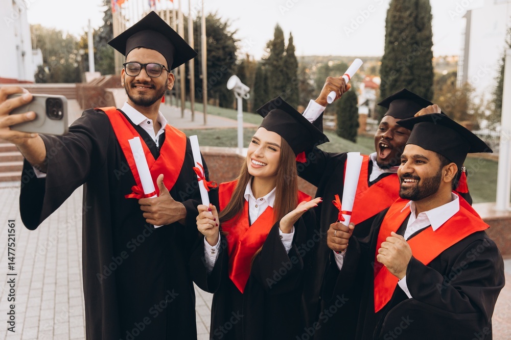 Group of Diverse Graduates Celebrating with Selfie Outdoors in Traditional Caps and Gowns