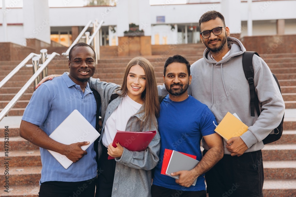 Diverse Group of Happy University Students Posing Together on Campus Steps Holding Notebooks
