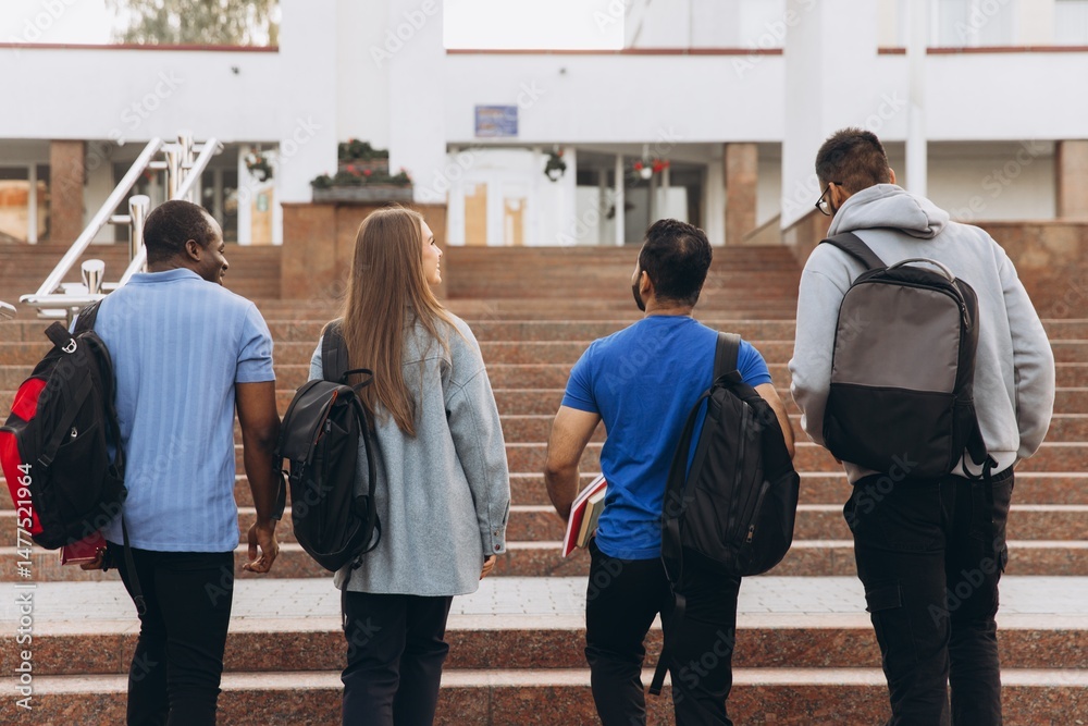 Group of Diverse Students Walking Up Stairs to University Campus With Backpacks
