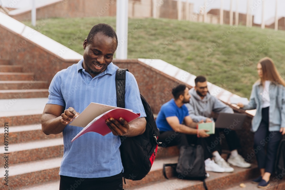 Group of College Students Studying and Collaborating Outdoors on University Campus Steps