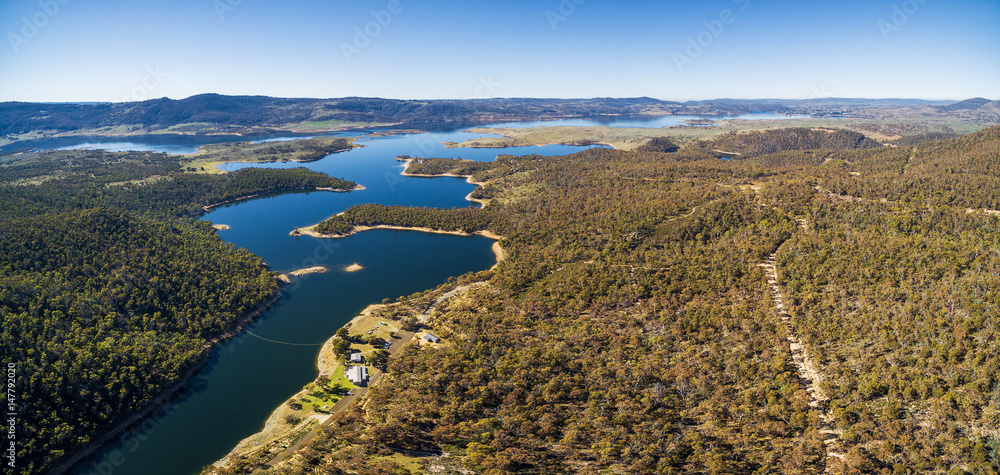 Aerial panorama of Snowy River flowing among green hills of Australian Alps and lake Jindabyne