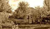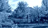 Two beautiful Eastern Redbud trees, Cercis Canadensis, in a residential yard bursting with pink blooms with a blue bench under the small tree.
