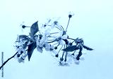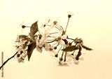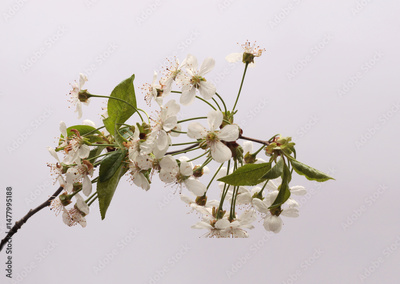 White blooming cherry branch on gray beige neutral background. Minimalist natuural still life.