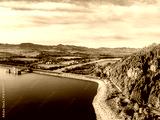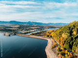 Liptov region with Tatras mountains around. Liptovska mara dam landspace. Autumn deciduous forest view from above