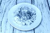 A plate of freshly prepared beef meat fried rice on a white wooden table