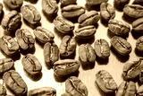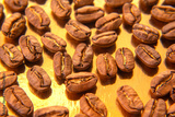 Roasted coffee beans in an oval shape on a reflective gold backdrop, displaying their warm brown shades and subtle textures. Suitable for culinary projects.