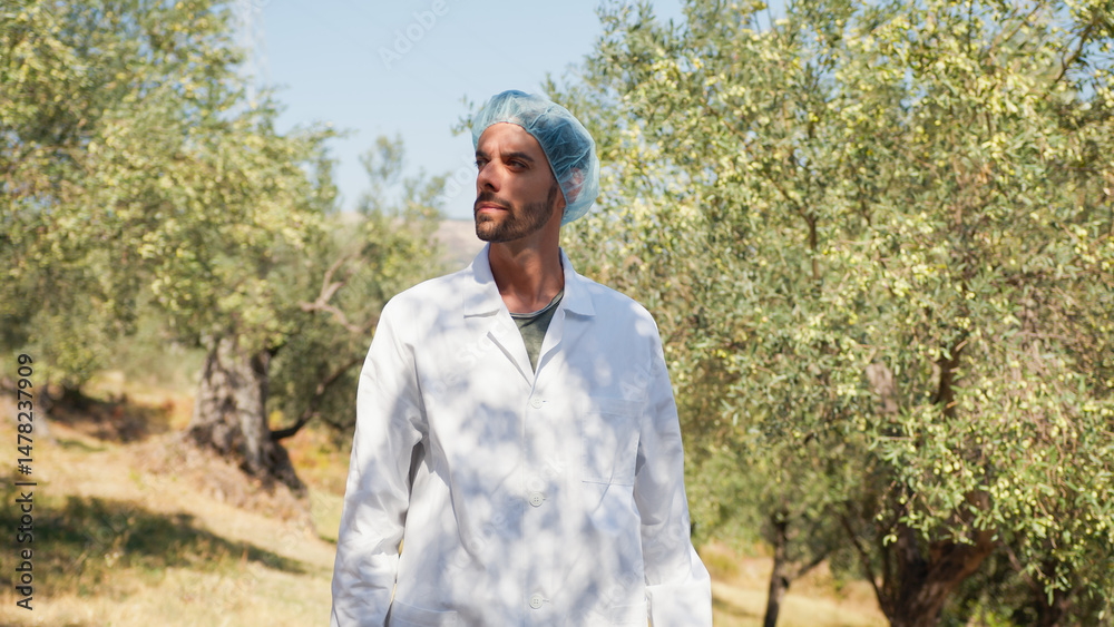 Agronomist looking at olive trees in the countryside