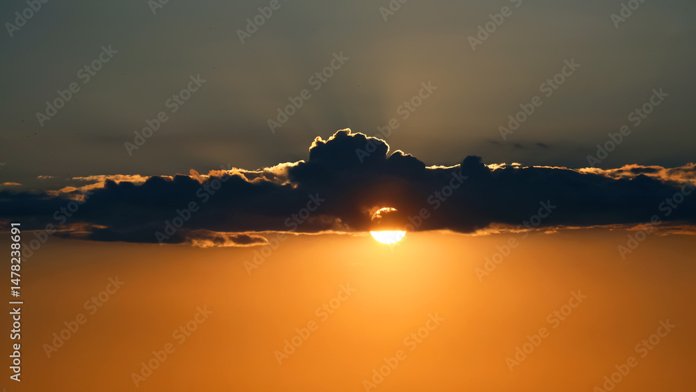 A breathtaking sunset where the sun is partially obscured by a dense cloud. The golden glow radiates through the sky, casting a serene and atmospheric scene.