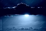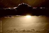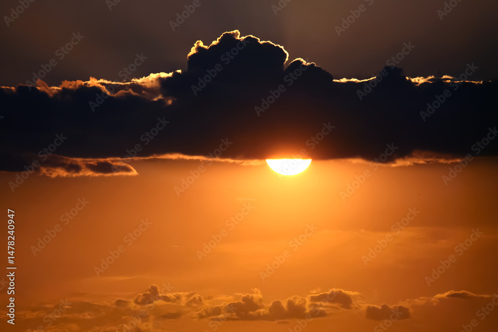 A breathtaking sunset where the sun is partially obscured by a dense cloud. The golden glow radiates through the sky, casting a serene and atmospheric scene.