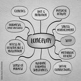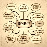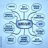 Longevity - how long and how well we live - is influenced by a mix of genetics, lifestyle, environment, and access to healthcare. Infographics mind map sketch.